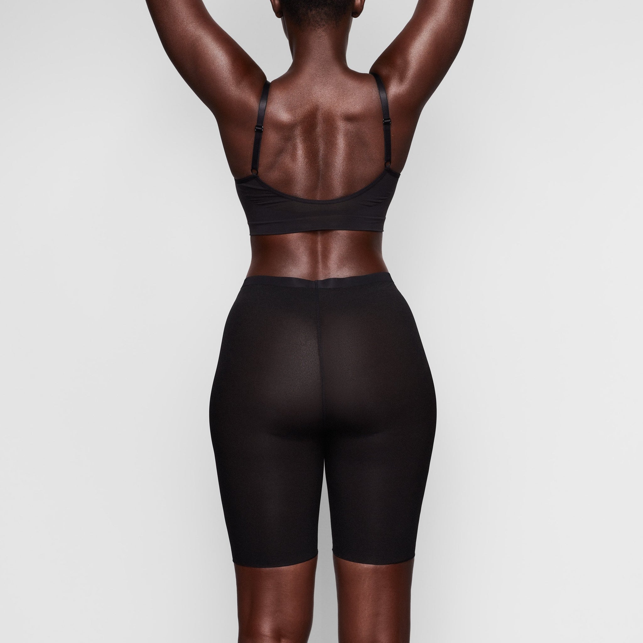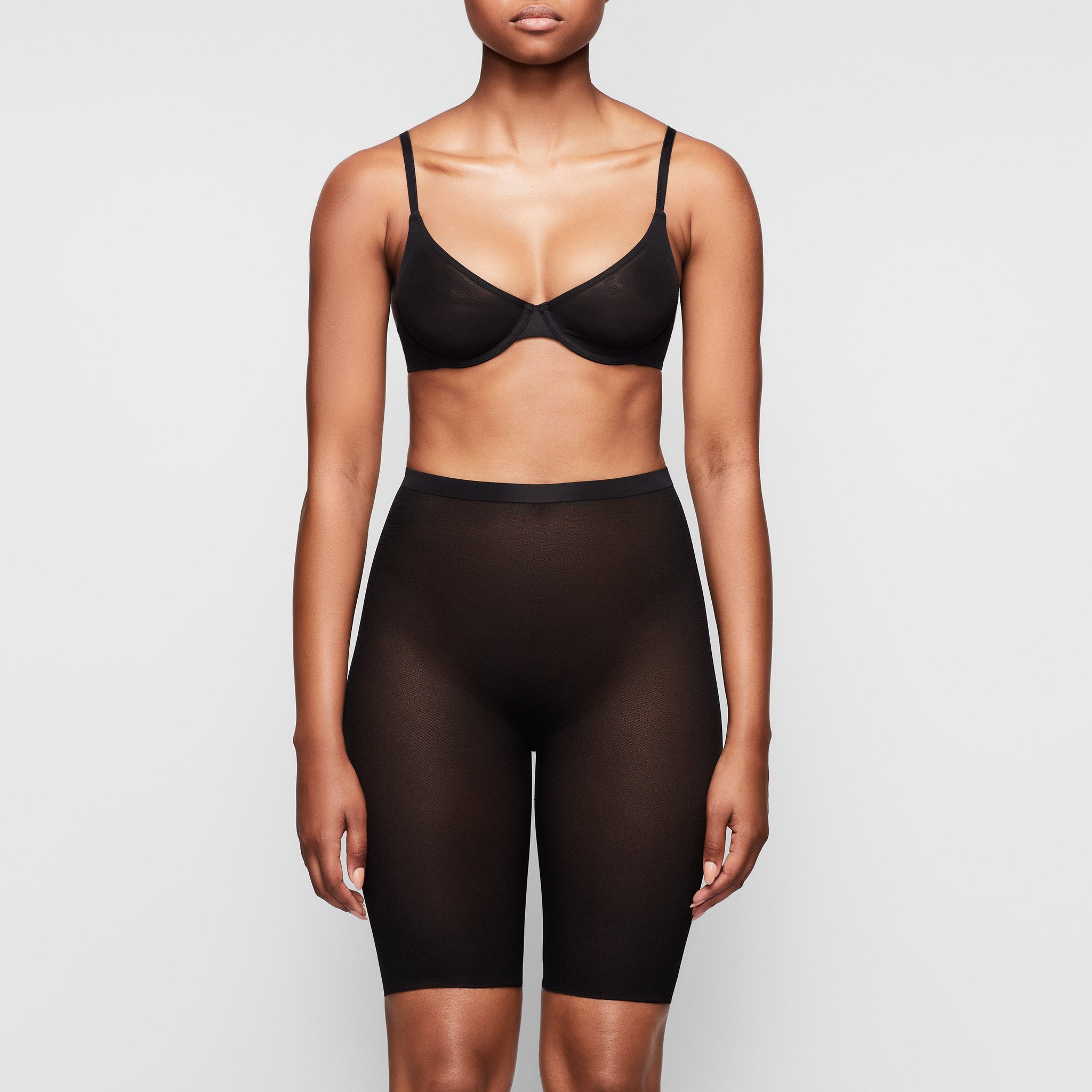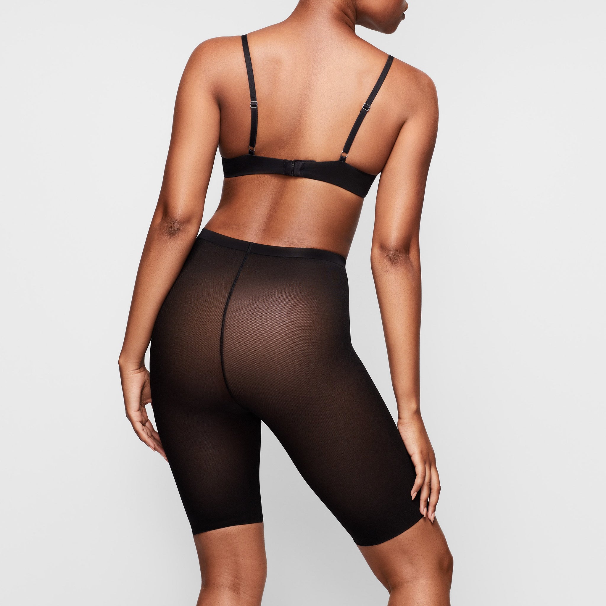With its mid-thigh length and high-waist rise, this sheer short holds in your core, smooths your thighs, and shapes and lifts your butt. Its silky construction makes this piece an unexpected essential for enhancing your body’s natural shape.