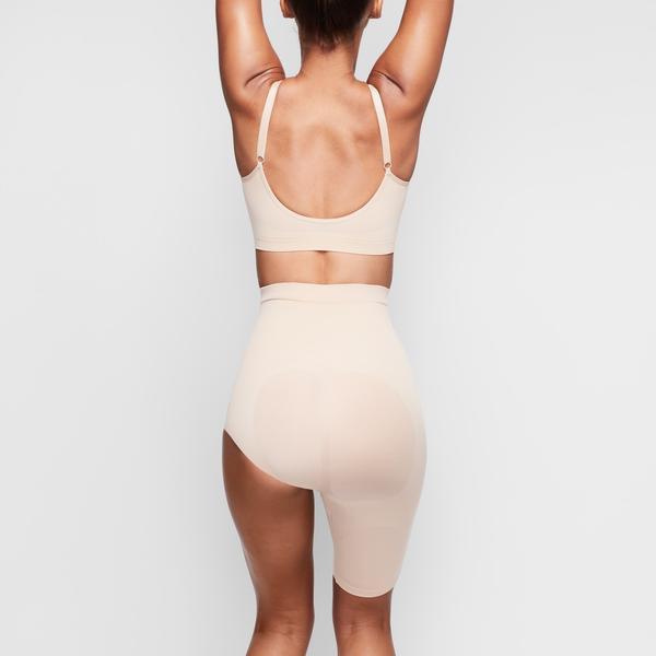 Kim’s sculpting solution to high-slit skirts. This soft and seamless micro short holds in your core, smooths your thigh, and lifts and shapes your butt.