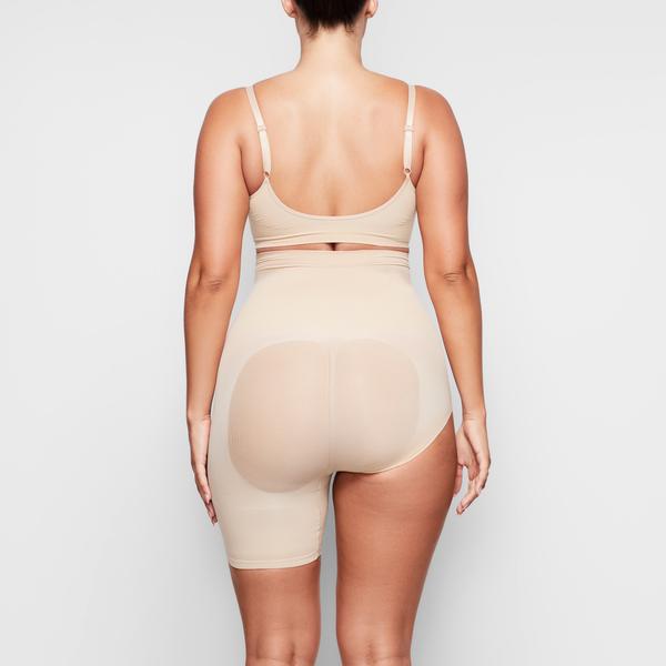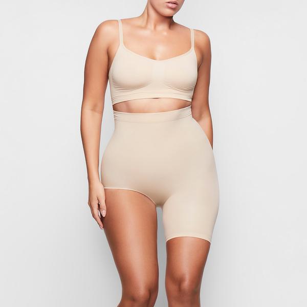 Kim’s sculpting solution to high-slit skirts. This soft and seamless micro short holds in your core, smooths your thigh, and lifts and shapes your butt.