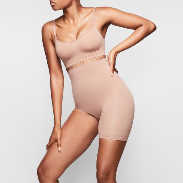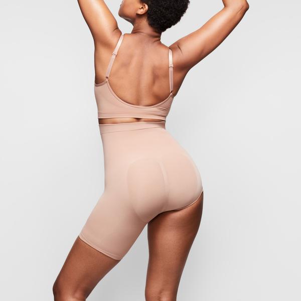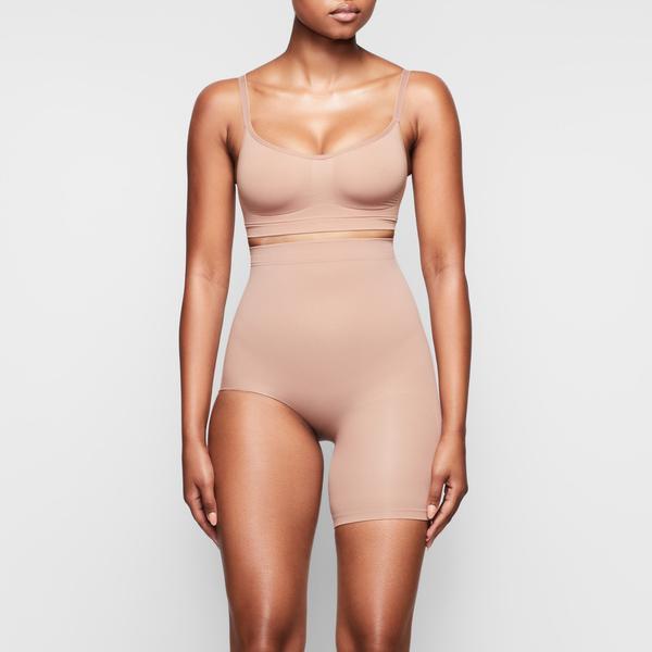 Kim’s sculpting solution to high-slit skirts. This soft and seamless micro short holds in your core, smooths your thigh, and lifts and shapes your butt.