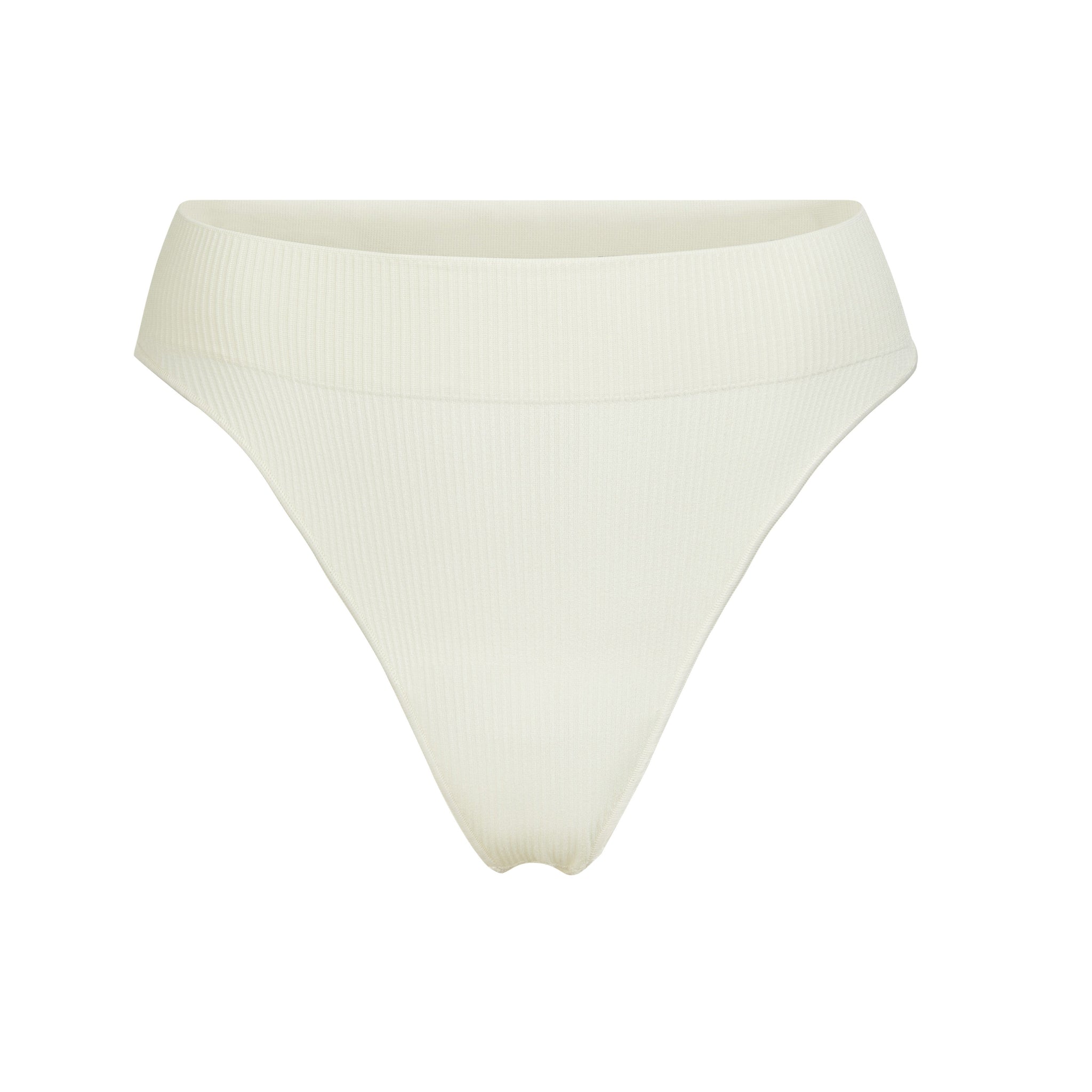 An everyday staple with added style and sexiness, the Stretch Rib Thong features a sporty high-rise cut in a super-soft textured fabric that hugs and flatters the curves of your body. Thong back provides seamless styling when worn under clothing.