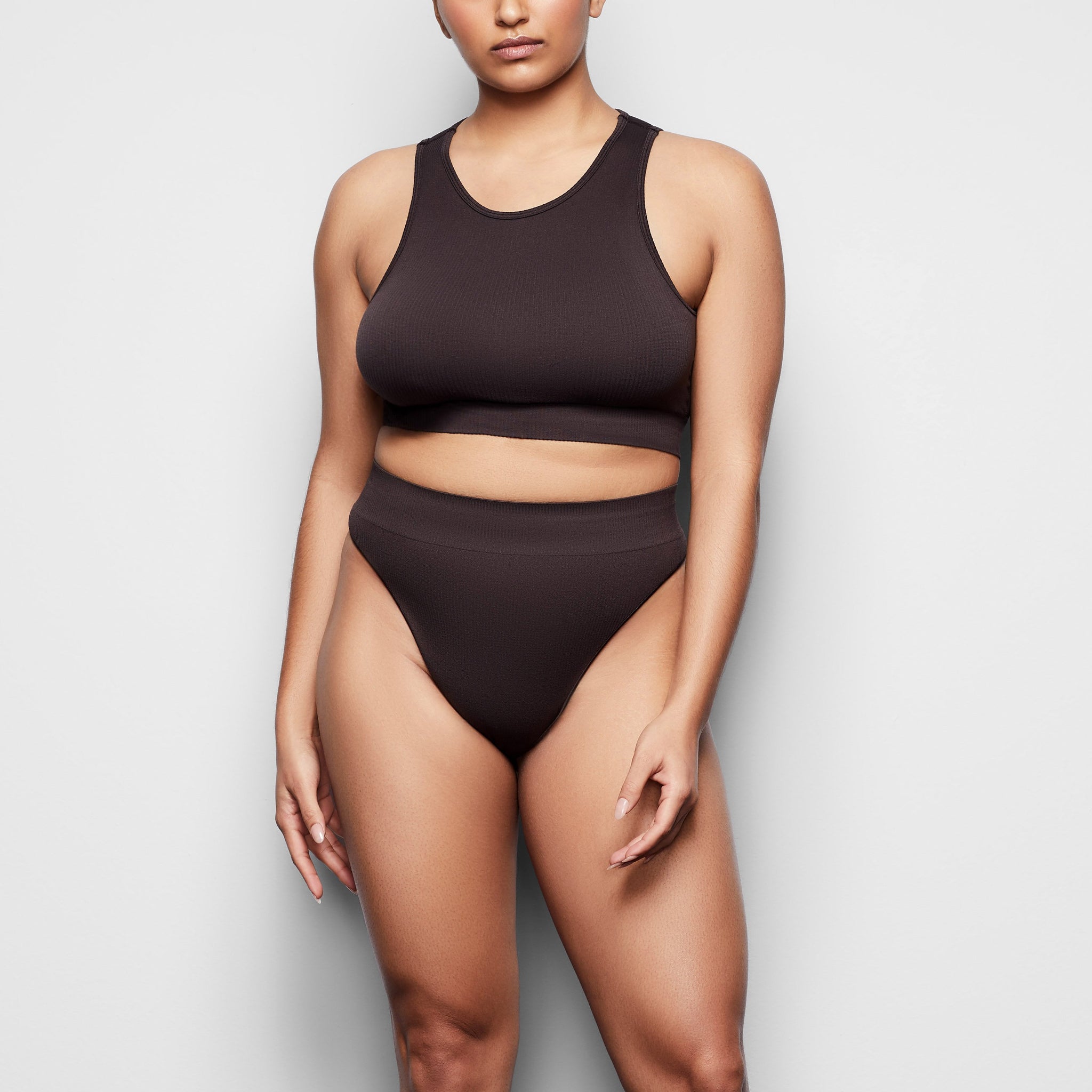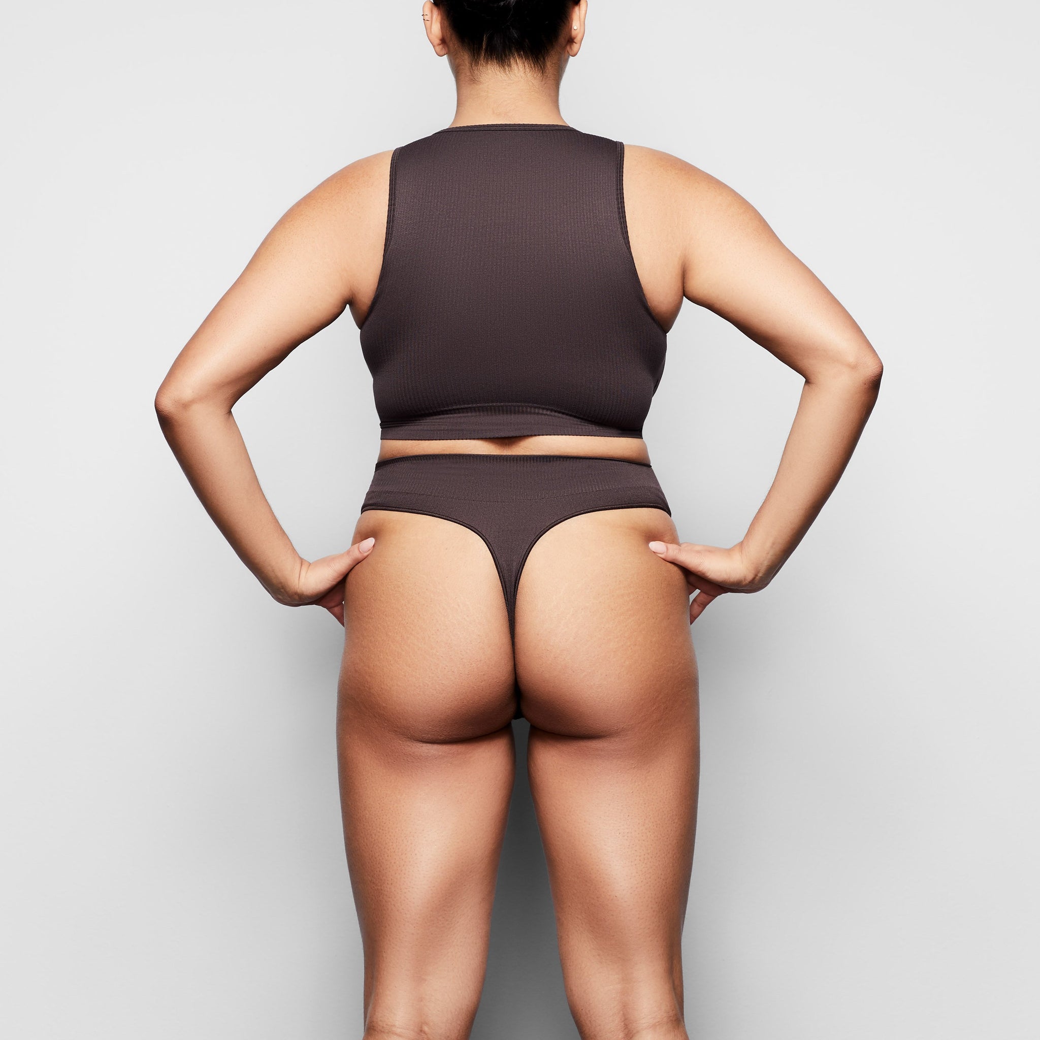 An everyday staple with added style and sexiness, the Stretch Rib Thong features a sporty high-rise cut in a super-soft textured fabric that hugs and flatters the curves of your body. Thong back provides seamless styling when worn under clothing.