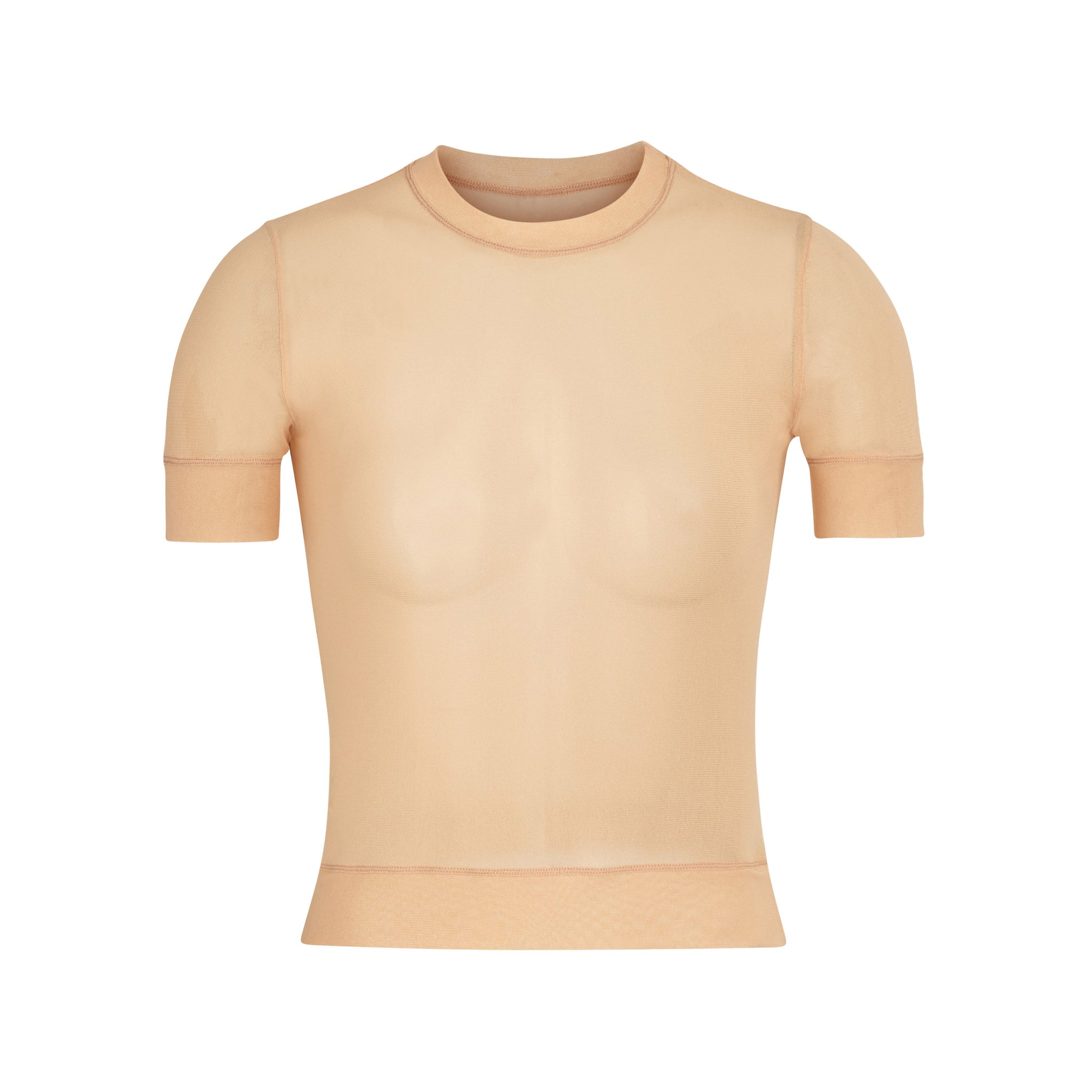 The Summer Mesh T-Shirt has a lightweight, barely-there feel and can be worn alone as loungewear or layered over bras for going out. The wide hem, ringer collar and sleeve bands give this top a classic look while stitching adds an elevated detail.