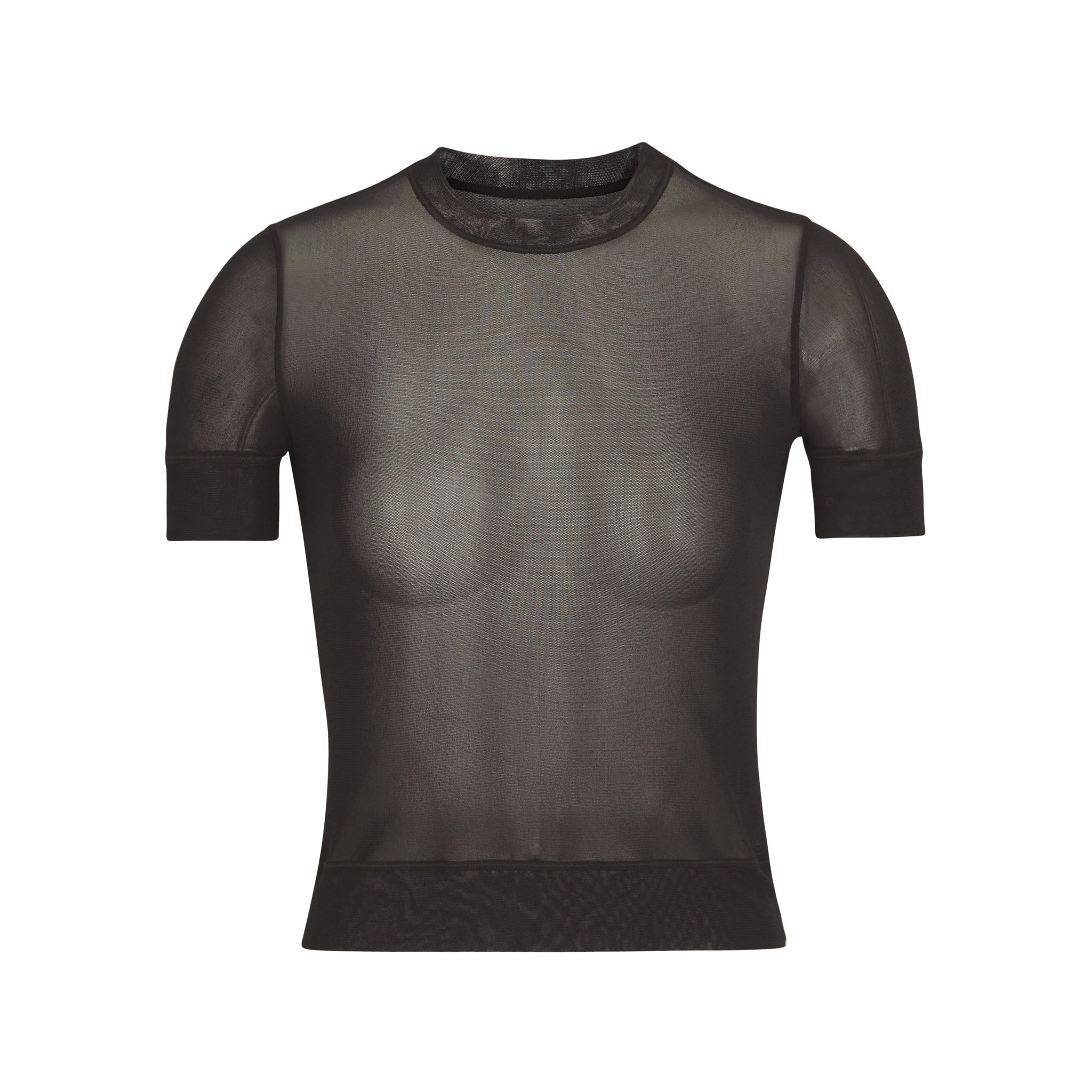 The Summer Mesh T-Shirt has a lightweight, barely-there feel and can be worn alone as loungewear or layered over bras for going out. The wide hem, ringer collar and sleeve bands give this top a classic look while stitching adds an elevated detail.